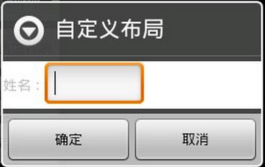 | LayoutInflater inflater = getLayoutInflater(); View layout = inflater.inflate(R.layout.dialog, (ViewGroup) findViewById(R.id.dialog)); new AlertDialog.Builder(this).setTitle("自定义布局").setView(layout) .setPositiveButton("确定", null) .setNegativeButton("取消", null).show();